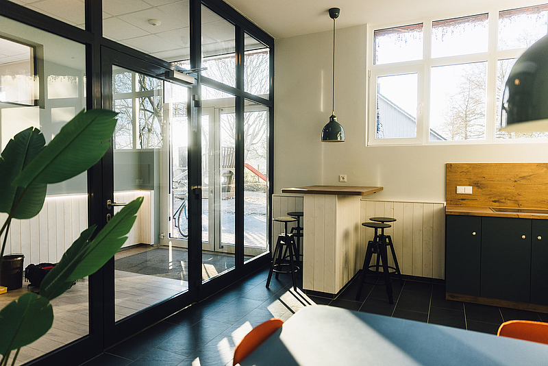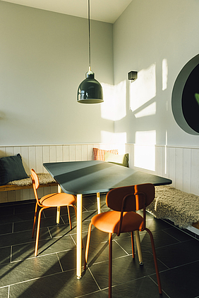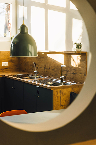 Eine neue Küche mit Sitzecke, modernen Kochmöglichkeiten, einem großen Esstisch und gemütlicher Chill-Area lädt zum Verweilen ein.