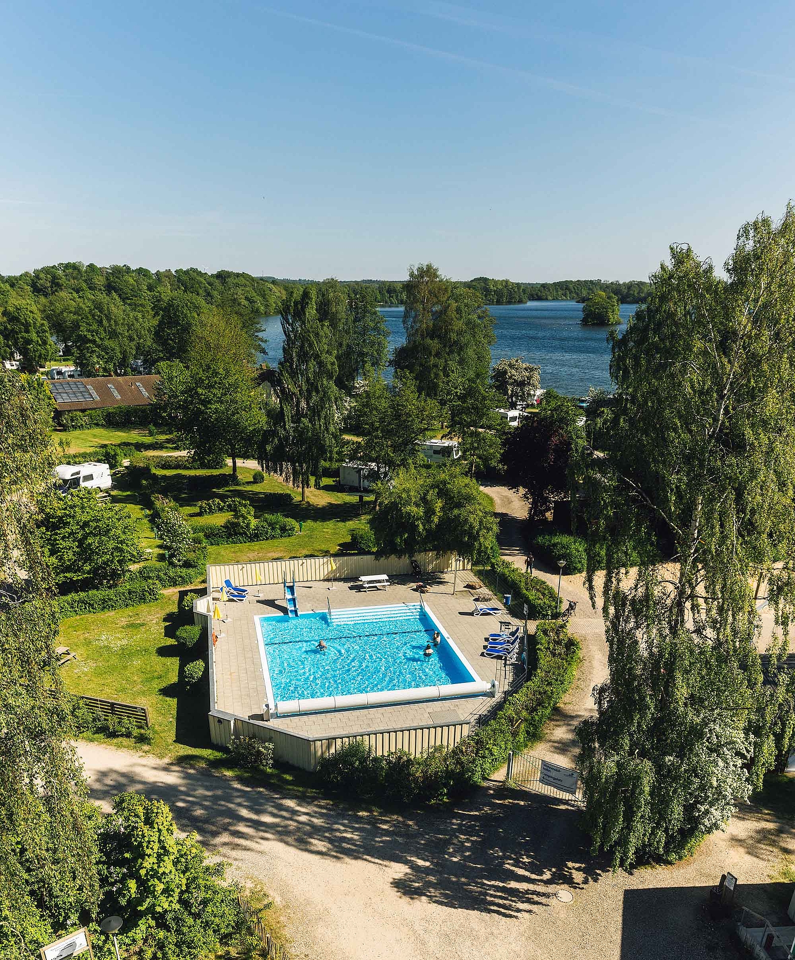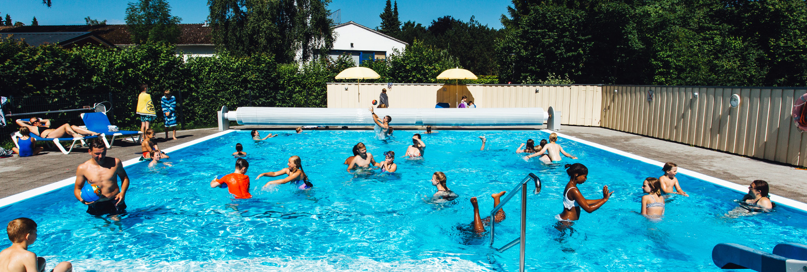 Im 120 m² großen Außenpool können große und kleine Wasserratten nach Herzenslust planschen und toben. Er ist zwischen 0,90 und 1,35 m tief und wird durch eine Solaranlage beheizt. Eine große Treppe schafft vor allem für kleine Kinder einen problemlosen Zugang und erleichtert so die Wassergewöhnung.