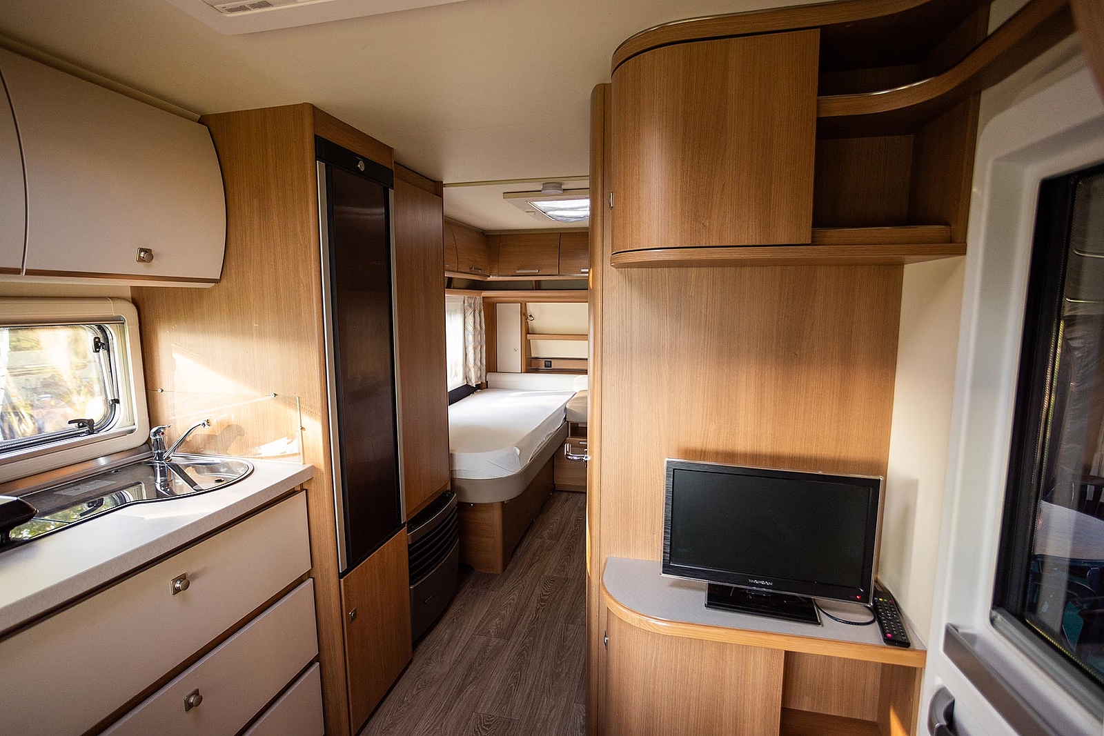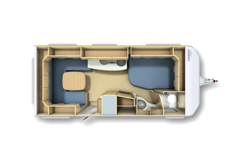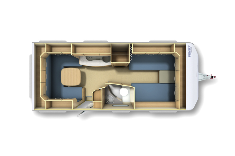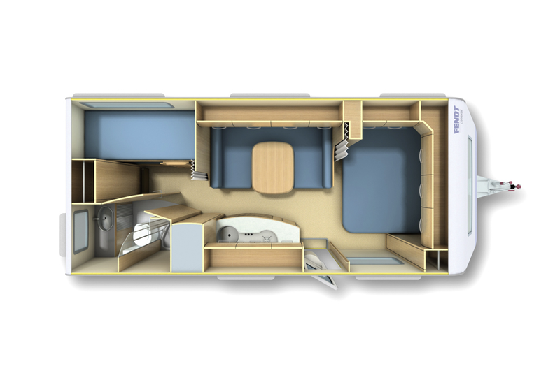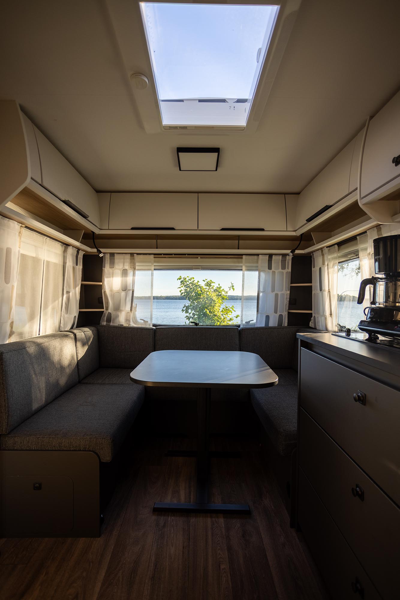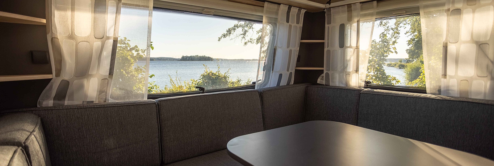 Caravan der 5-m-Klasse mit Sitzgruppe und fest eingebautem Doppelbett.
